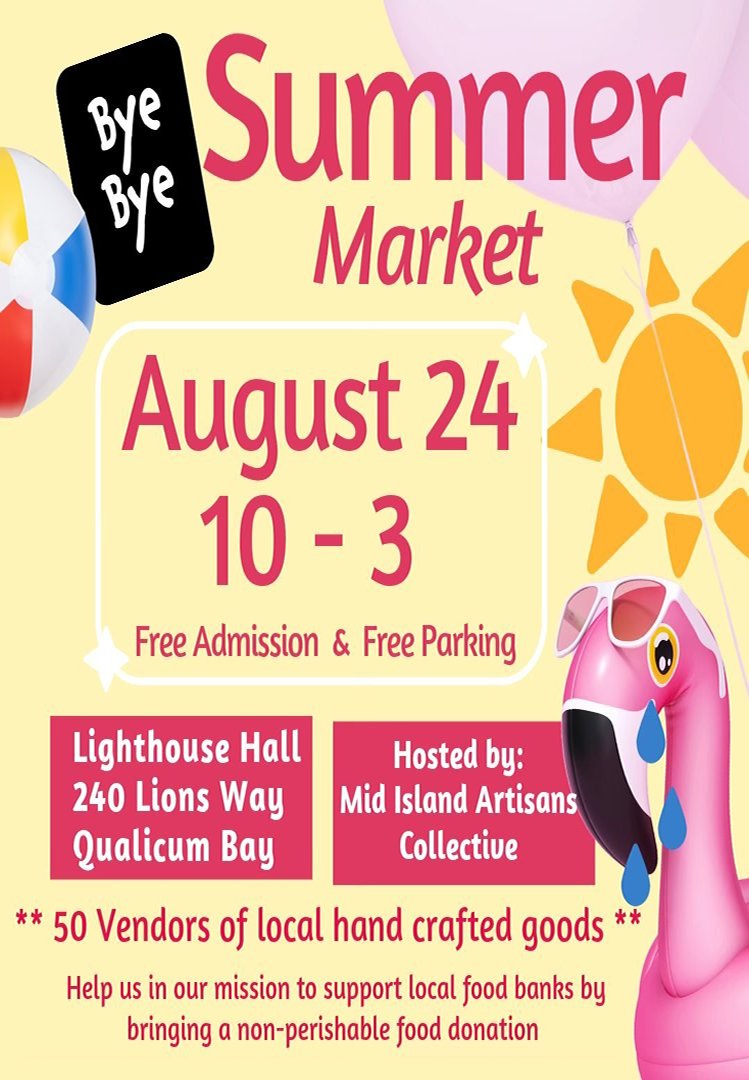 Bye Bye Summer Market Saturday, August 24, 2024 10:00 a.m. 3:00 p.m. Google Calendar ICS Lighthouse Hall240 Lions Way, Qualicum Bay, BC