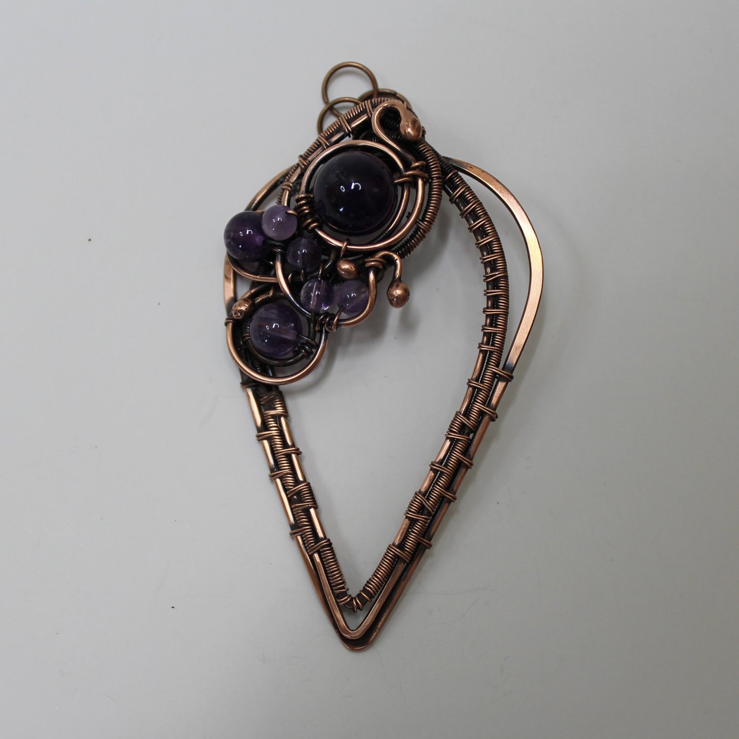 Hammered Copper wire weave pendant with Amethyst beads. I’ve used a torch to create ball ends on the wires.