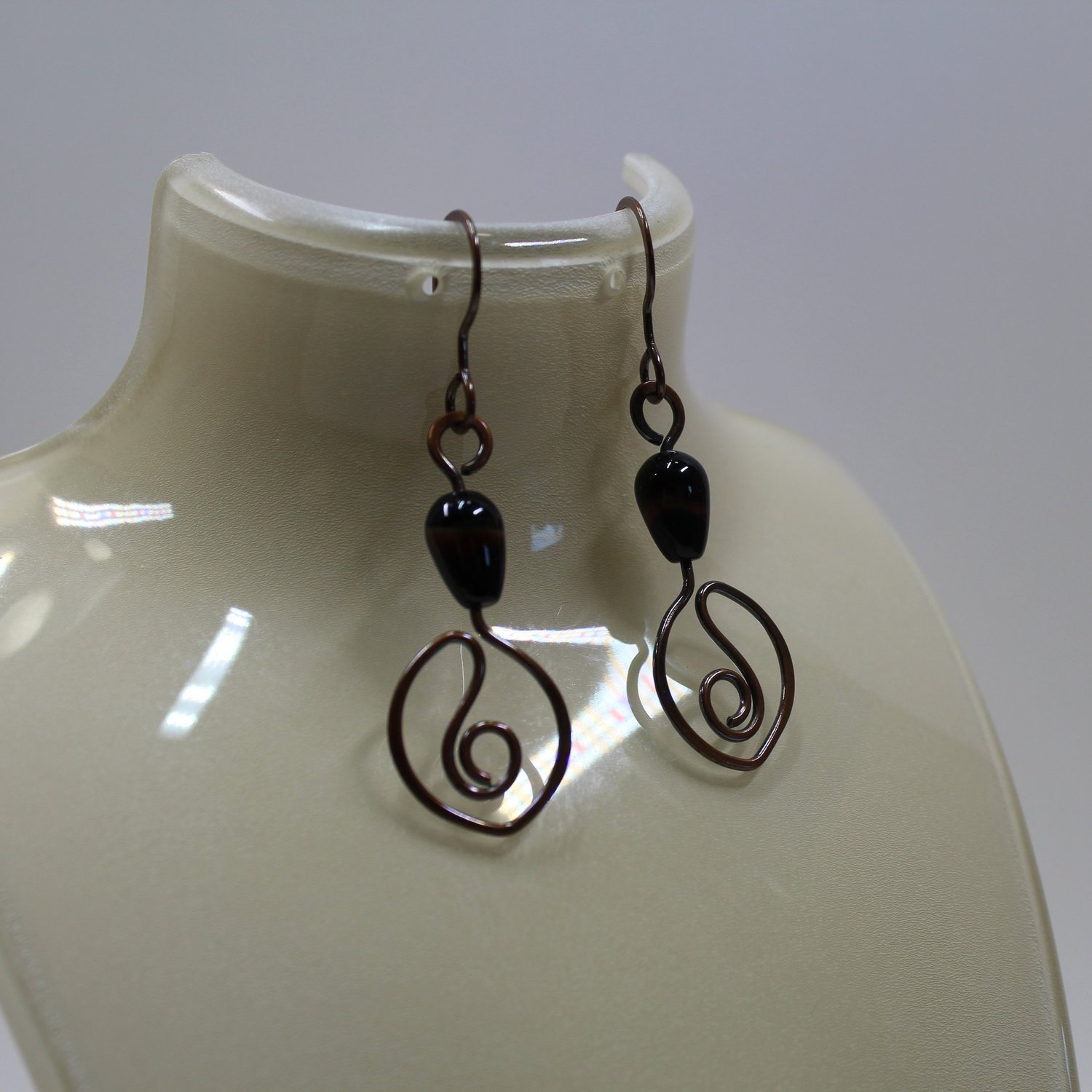 Image 1 of 8 Image 2 of 8 Image 3 of 8 Image 4 of 8 Image 5 of 8 Image 6 of 8 Image 7 of 8 Image 8 of 8 **SOLD** Black Agate Copper Wire Leaf Earrings $20.00 sold out Handmade copper wire leaf-shaped earrings with drop-shaped Black & brown Agate bead. Handmade ear wires. Sold Out Added! Handmade copper wire leaf-shaped earrings with drop-shaped Black & brown Agate bead. Handmade ear wires.