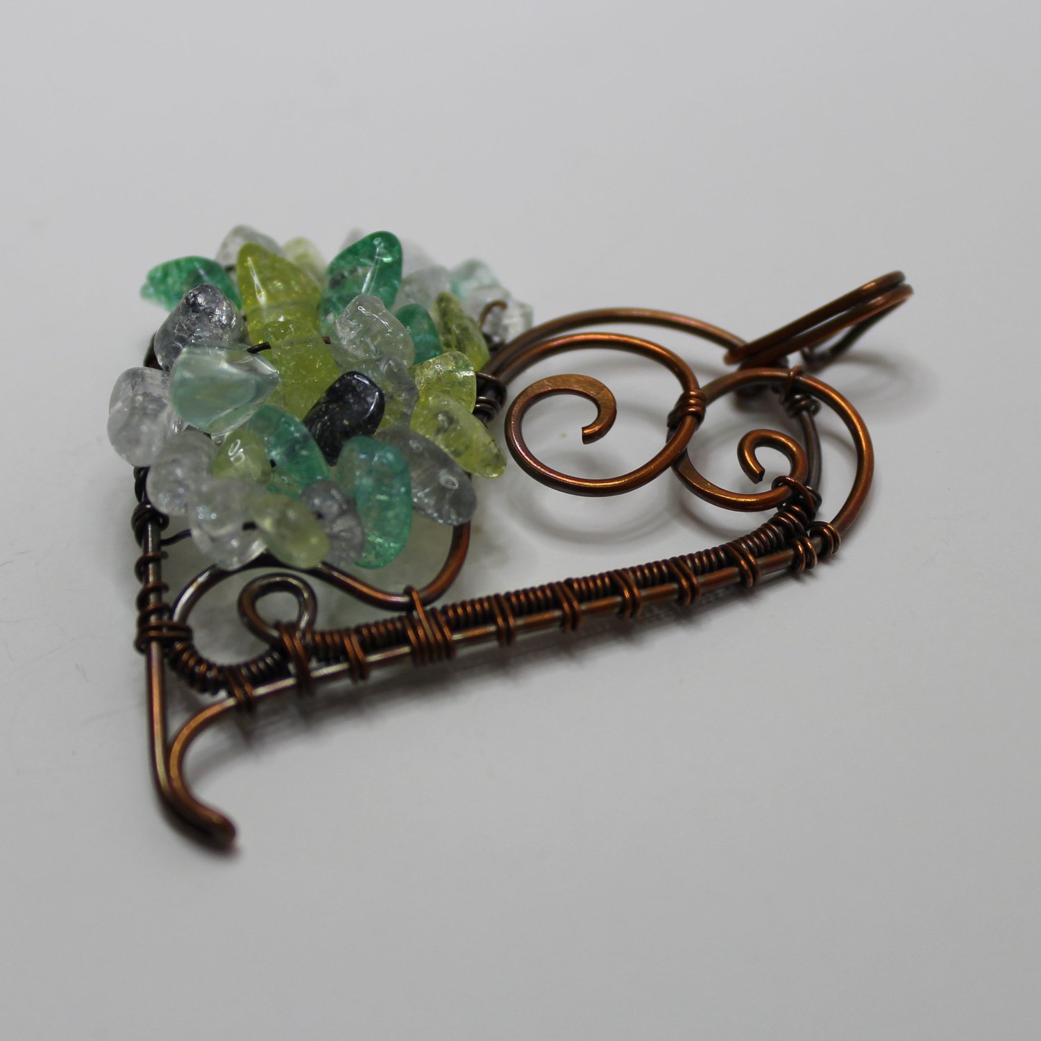 Copper wire weave heart pendant with glass chip beads in clear, teal, yellow and grey.