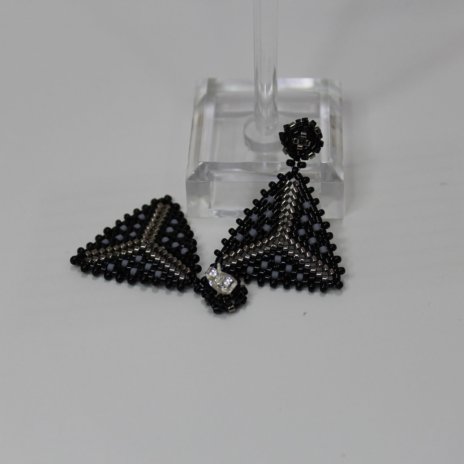 Beaded Stud Earrings made with Miyuki Delica 11/o cylinder beads in black, galvanized duracoat silver and matte ghost grey with round black seed beads around the outside edges. Modified peyote stitch with herringbone to create a triangle shape. Ear Studs are hypoallergenic and beaded. Widest section is almost 3cm (1.2 inch) wide. Full earring length is 3.5 cm (just under 1.5 inch).