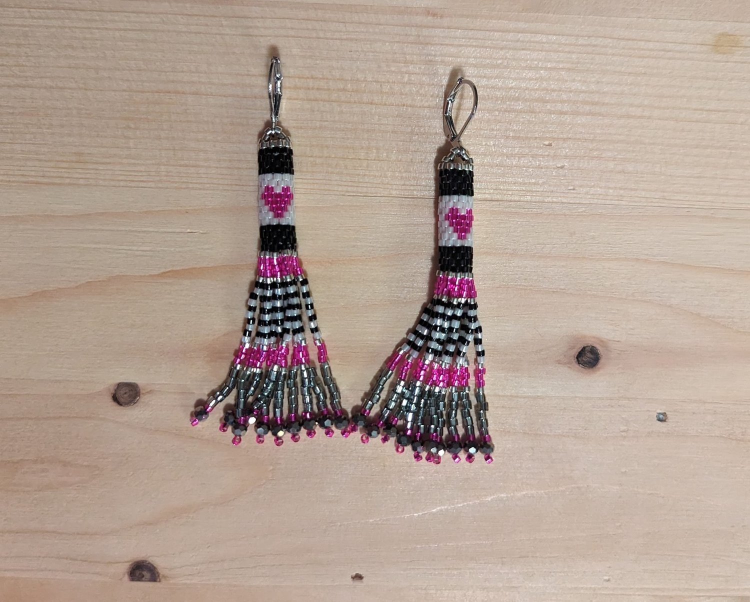 Handmade beaded fringe earrings using 11/o Miyuki Delica cylinder beads, short bugle beads and faceted 3mm hematite beads with stainless hypoallergenic lever-back ear wires. Colours are fuchsia, black, white, silver and grey. Total length (with ear wire) is approximately 7.5 cm (3 inch). The beading is done using Peyote stitch (made into a tube) with a fringe. The peyote section is 2 cm (1’) with a 4cm (1.5’) fringe. Add a little sparkle to your day! Makes a great gift for Valentine’s Day.