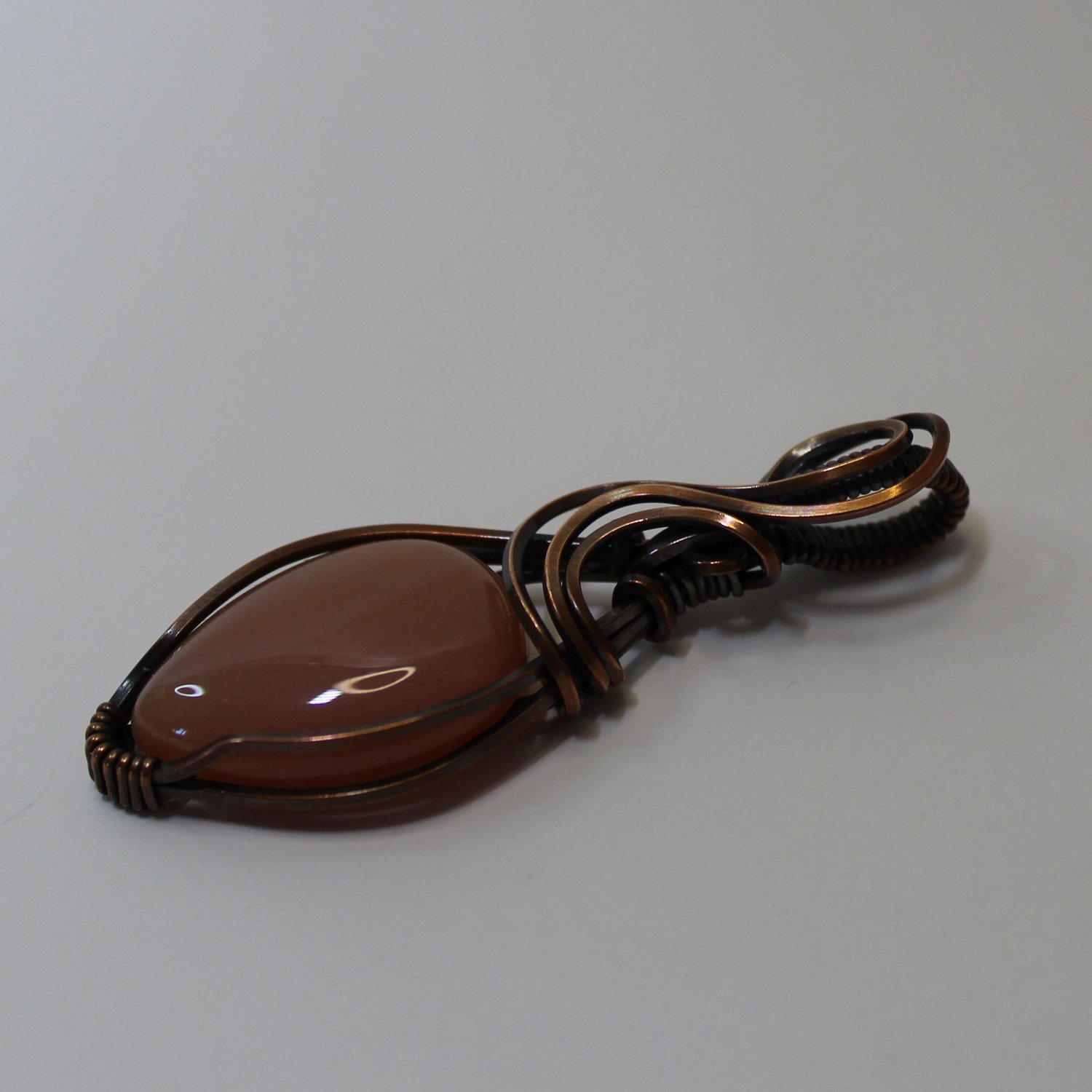Drop-shaped peach quartz cabochon wrapped in square copper wire.