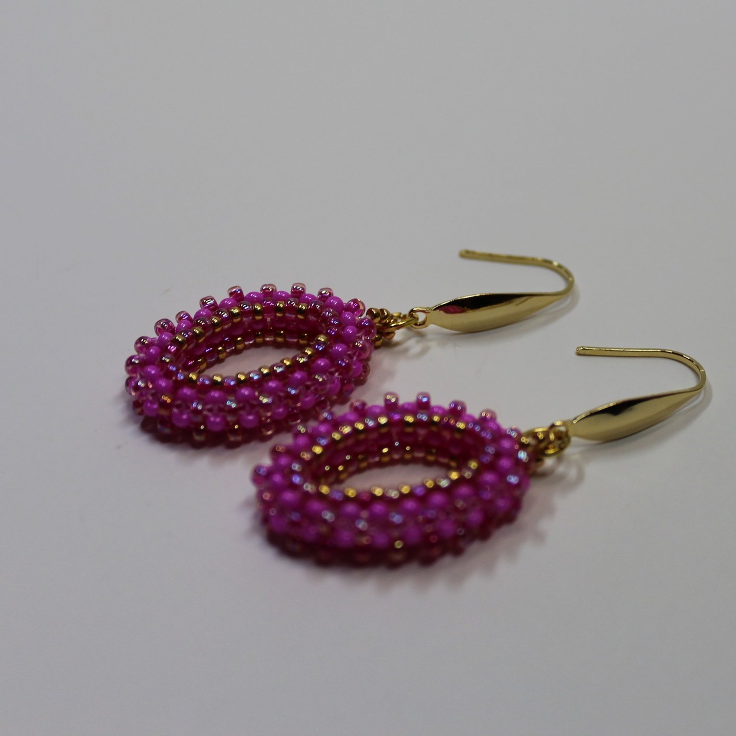 Modified CRAW (cubic right angle weave) stitched earrings made using 11/0 Miyuki crystal hot pink & Preciosa opaque rose with 15/o Miyuki galvanized dark gold. Ear findings are 24K Gold-plated 304 stainless steel.