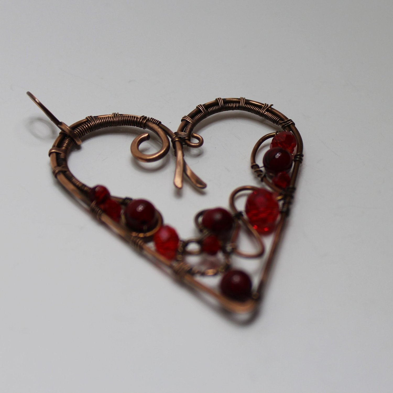 Copper wire weave heart pendant with red painted quartz and red faceted glass beads.
