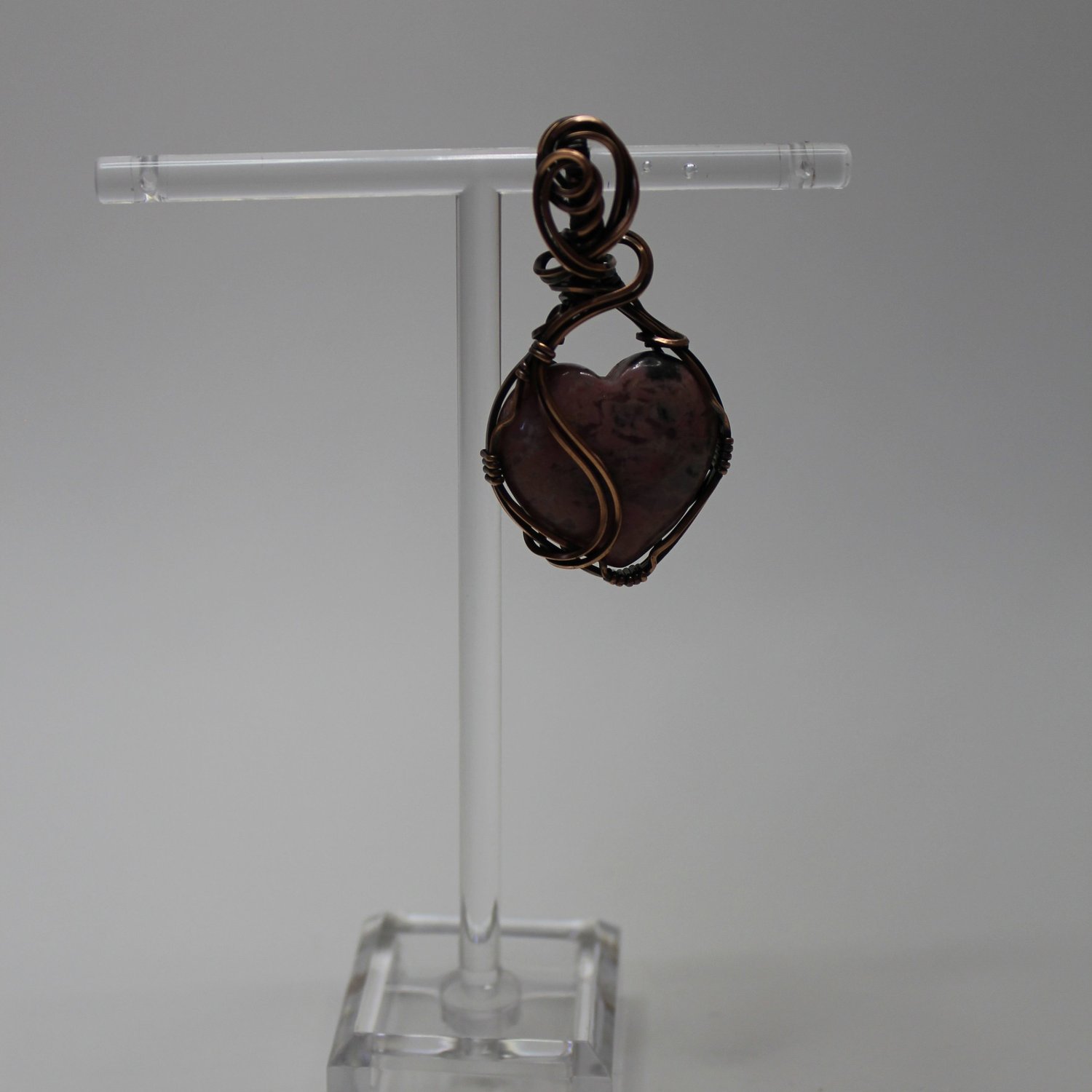 Heart shaped Rhodonite stone wrapped in square copper wire.