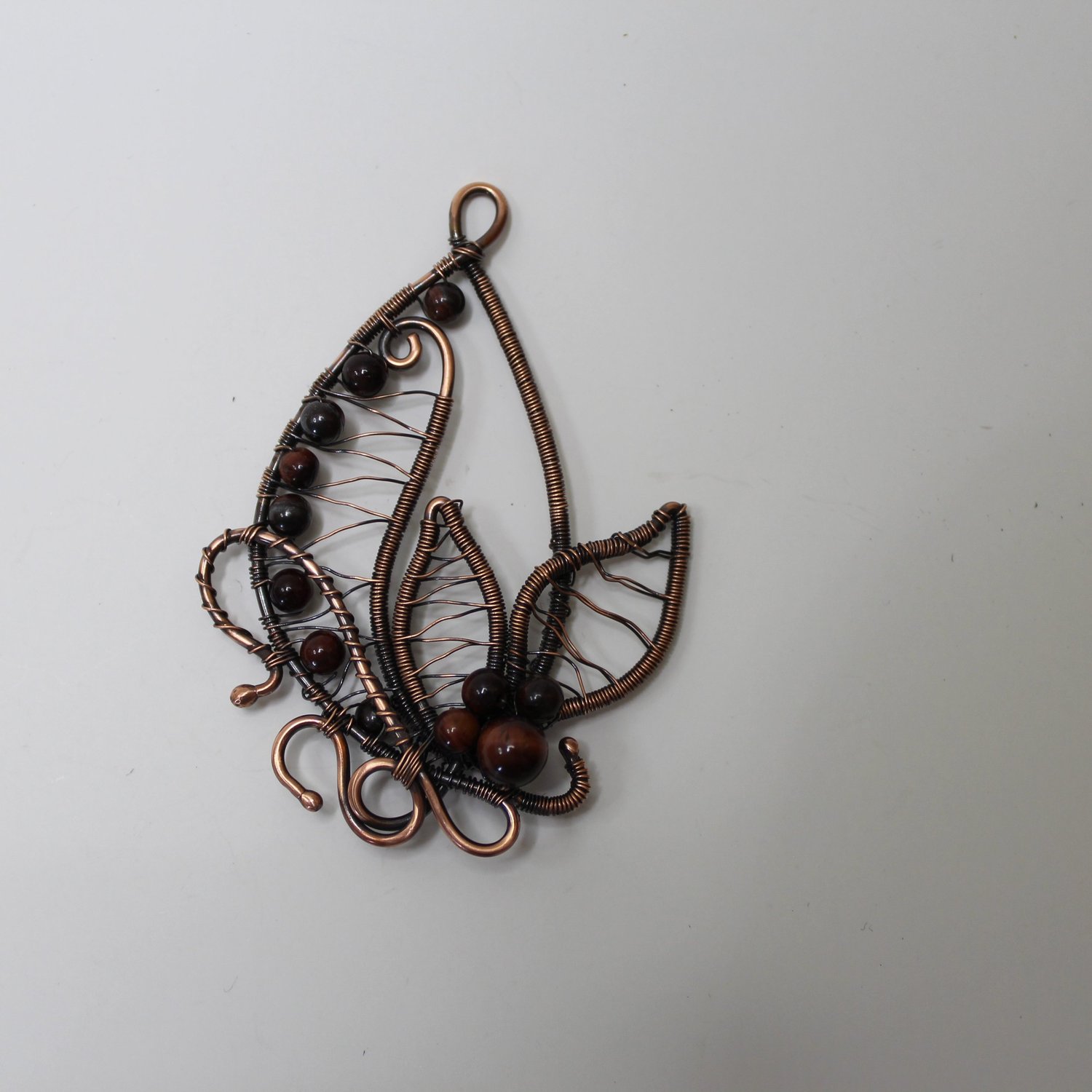 Copper wire leaf shaped pendant with Red Tiger Eye beads.